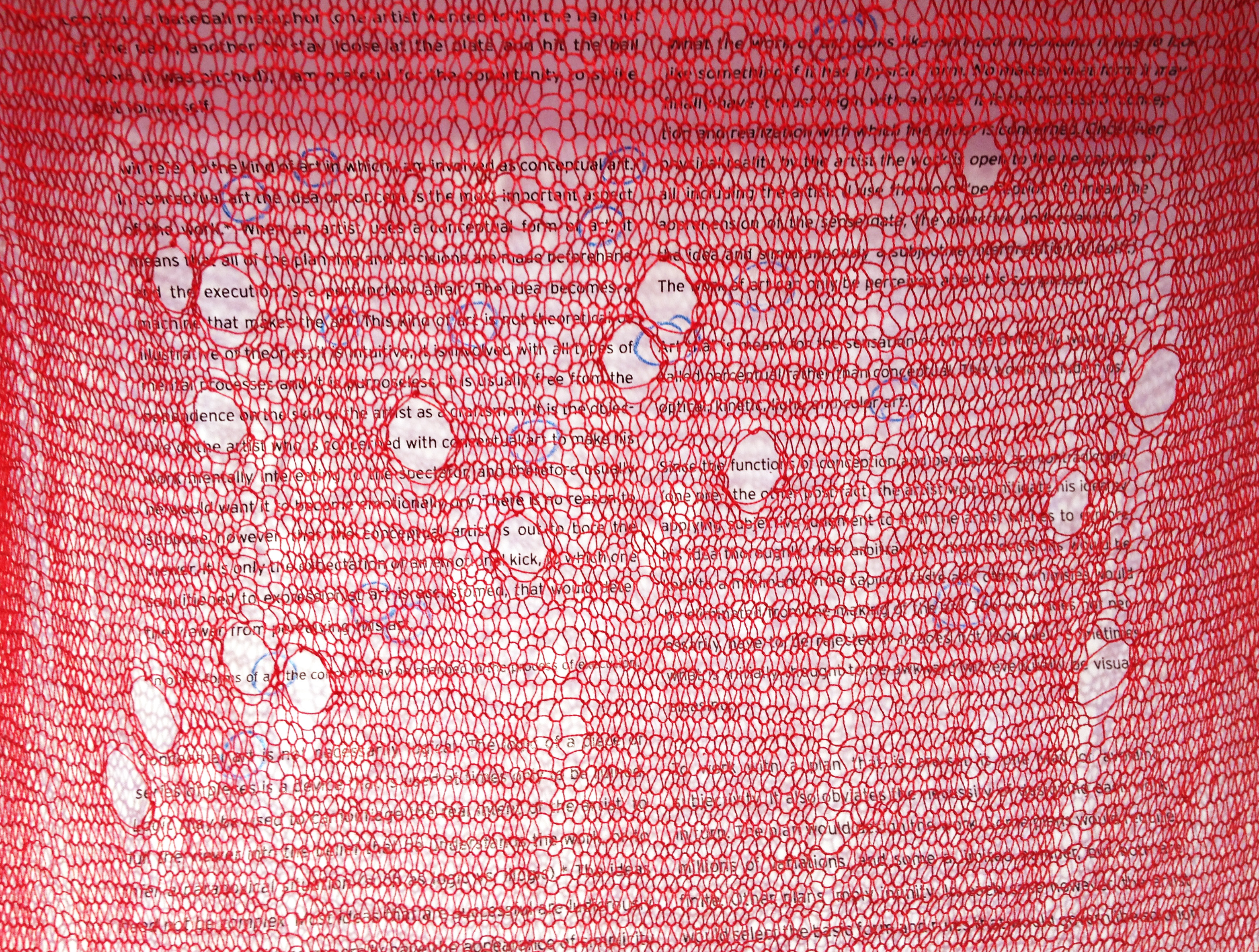 Sol LeWitt’s “Paragraphs on Conceptual Art” was copied, enlarged, printed, and holes were made over the word “art.” Over top is a knit scrim with holes ostensibly knit into the pattern to reveal the absent word.